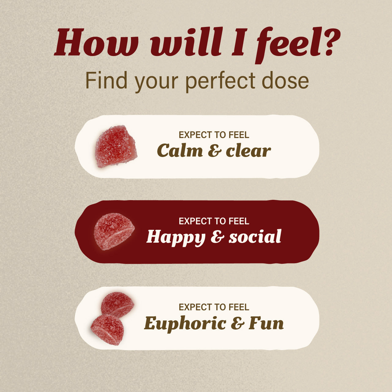 New to THC edibles? Everybody is different, so we recommend eating half a gummy to start, see how you feel, and build your dosage as needed.