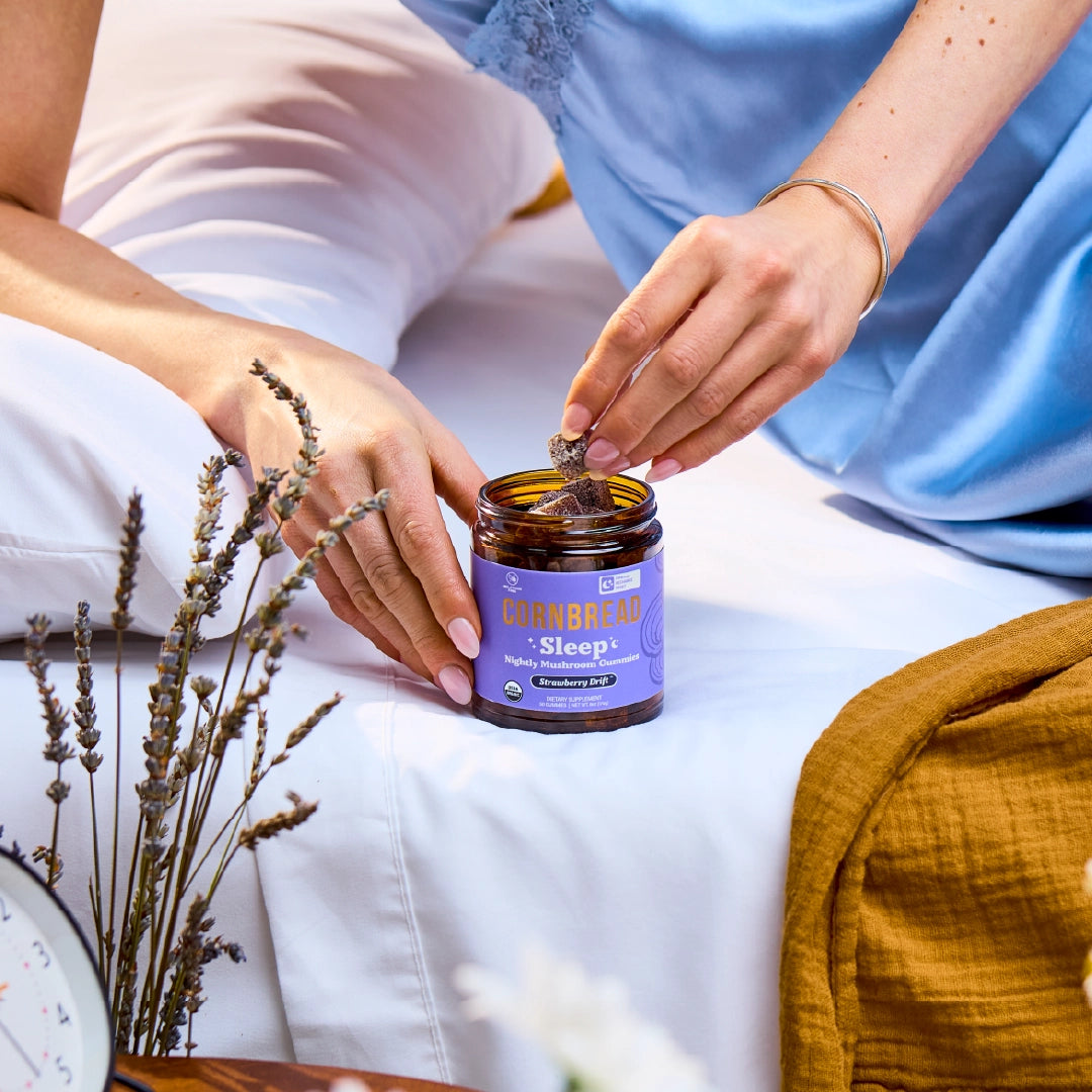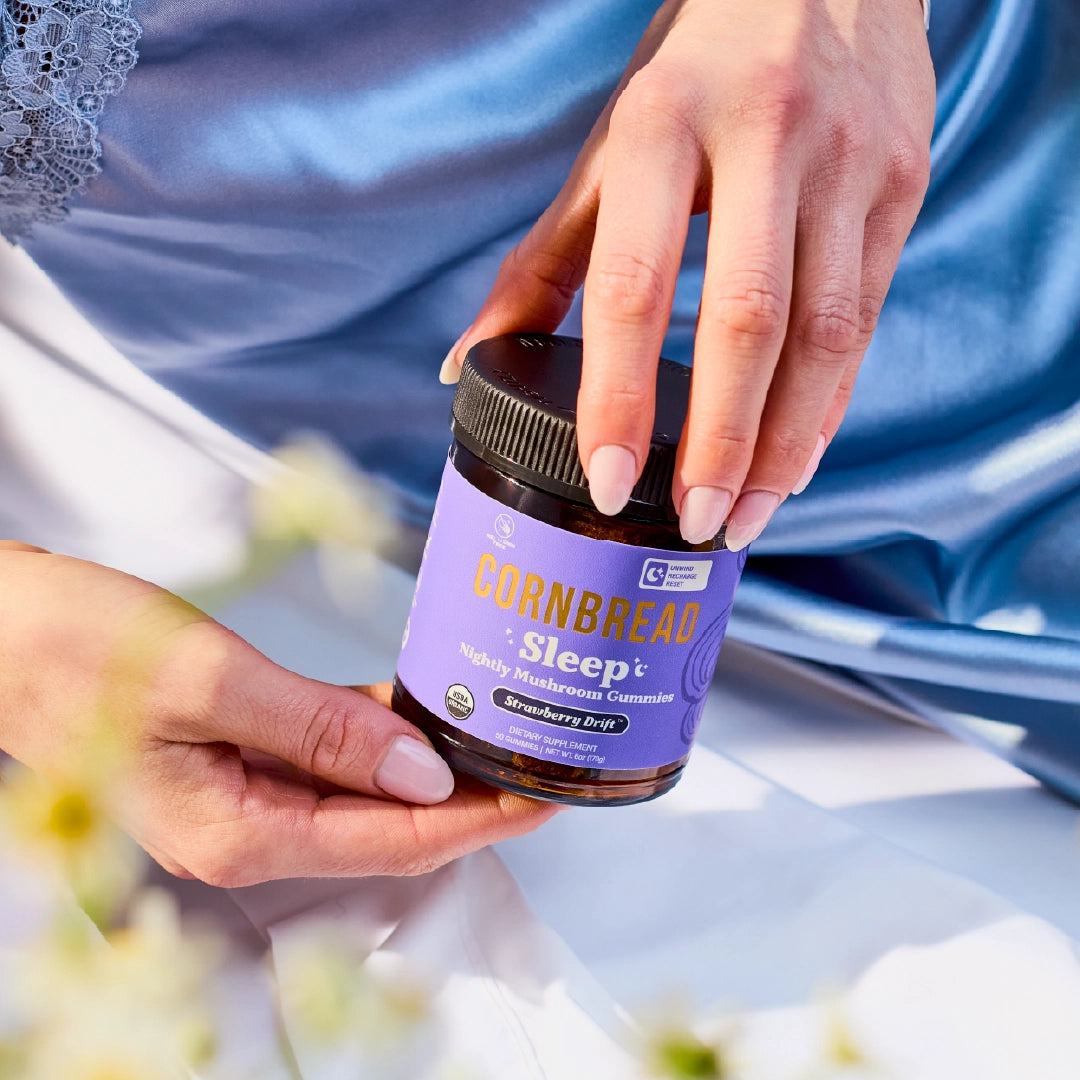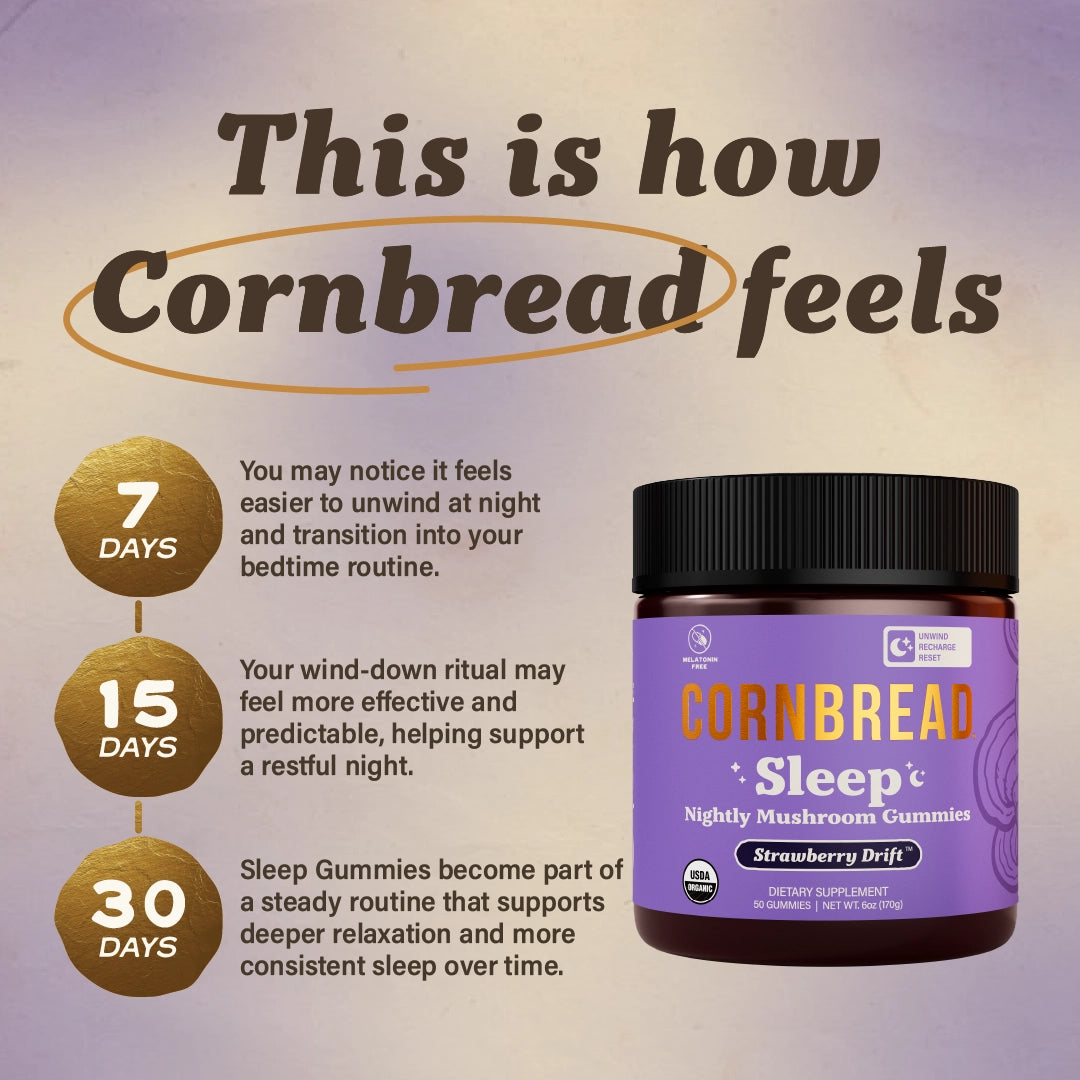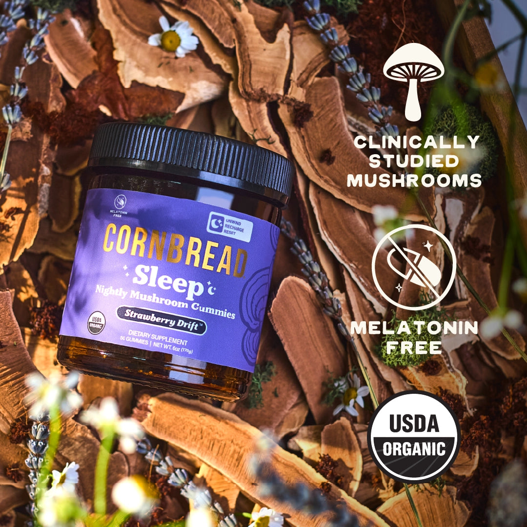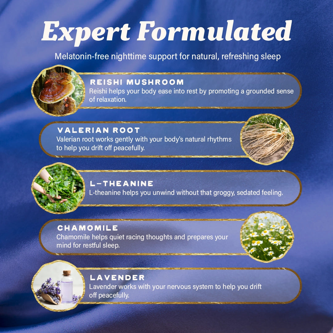 Organic Blue Agave, Organic Cane Sugar, Distilled Water, Organic Herbal Sleep Blend (chamomile Extract, Lavender Extract, Valerian Root Extract), Pectin, Organic Reishi Mushroom Extract, Organic Carnauba Wax, Organic L-Theanine (Derived from Green Tea), Organic Citric Acid, Organic Strawberry Flavor, Organic Butterfly Pea Powder, Organic Lavender Flower, Organic Chamomile Flower, Sodium Lactate.