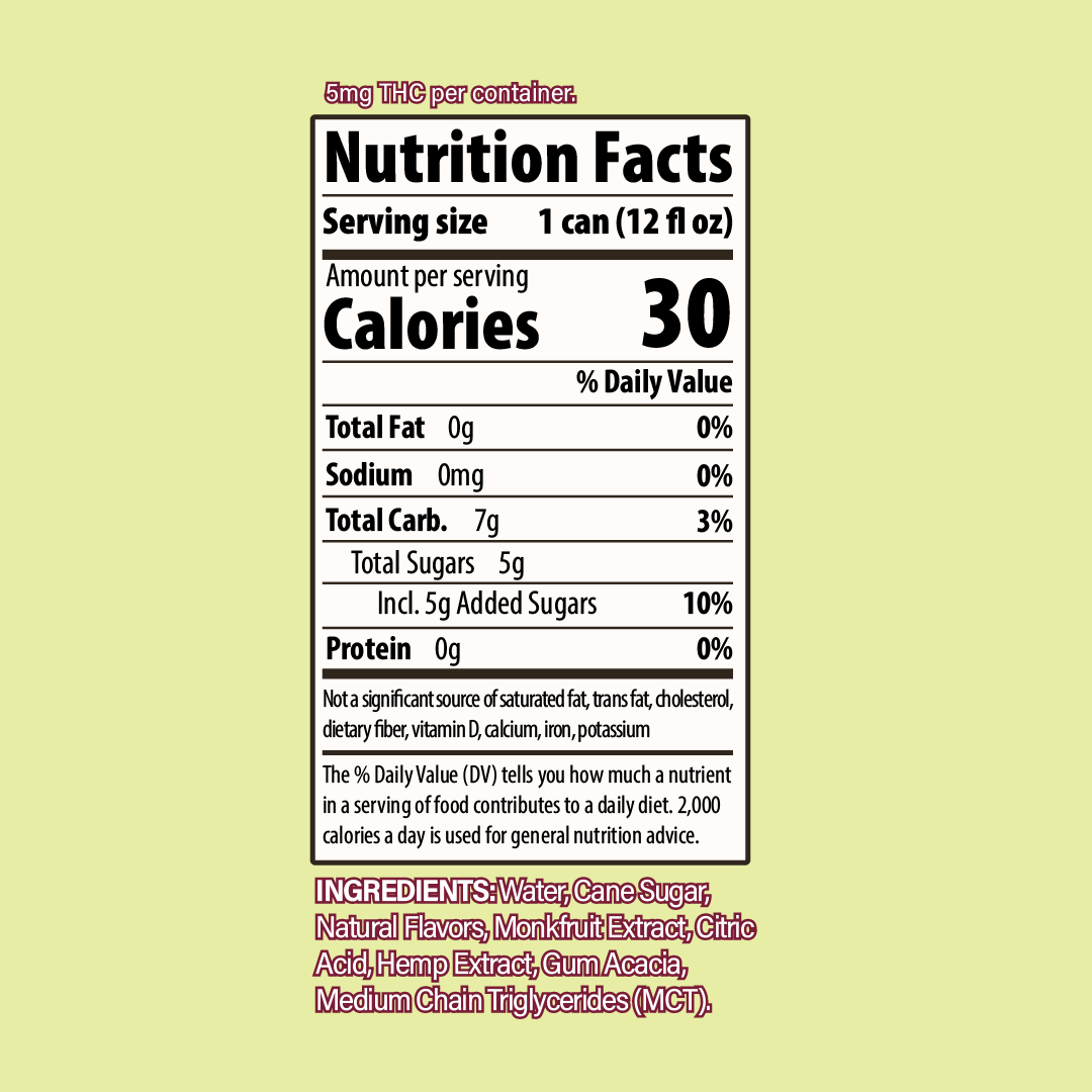 A refreshing THC seltzer infused with the flavor of juicy watermelon and a touch of salt for that crave-worthy pop. Each can delivers up to 10mg of THC for a smooth, consistent, and fast-acting buzz — no alcohol, no hangover, just good vibes. With only 30 calories and 5g of real cane sugar, it’s a light, guilt-free beverage perfect for social sipping.